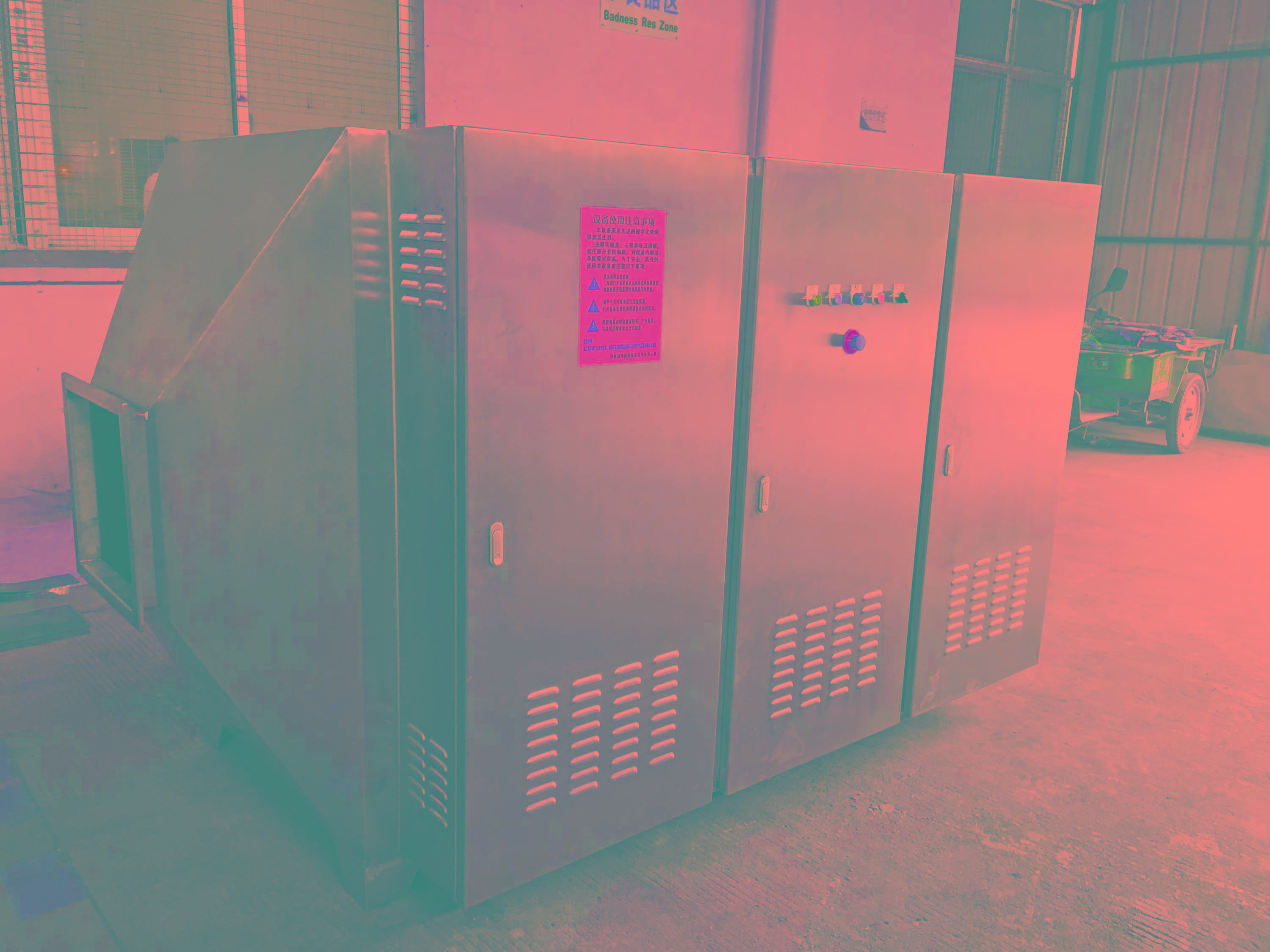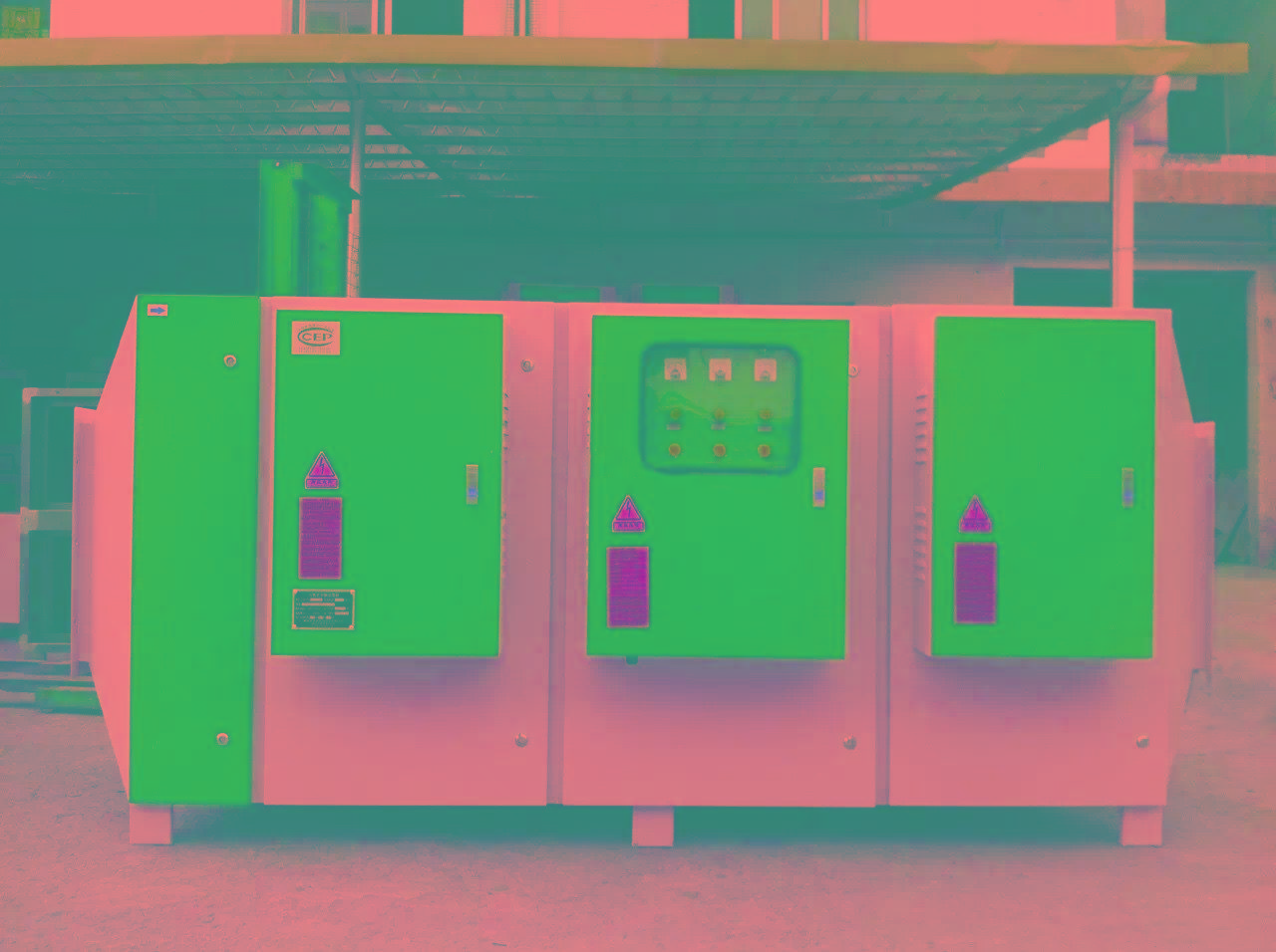 3、惡臭氣體利用排風設備輸入到本凈化設備后,凈化設備運用高能UV紫外線光束及臭氧對惡臭氣體進行協(xié)同分解氧化反應,使惡臭氣體物質其降解轉化成低分子化合物、水和二氧化碳,再通過排風管道排出室外。
